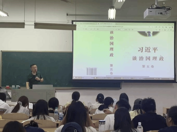 今年7月出版的《习近平谈治国理政》(第五卷)是全面系统反映习近平新时代中国特色社会主义思想最新成果的权威著作。高校思政课将党的创新理论最新成果融入课堂,用科学理论武装青年学生头脑意义重大。而面对不熟悉党史的青年学生,如何进一步将党史故事和经典理论讲活,是广大思政课教师持续探索的课题。9月19日下午,我们教授张齐武在“概论”课堂上讲授第四章“社会主义建设道路初步探索的理论成果”时,并没有停留在对史实的简单介绍,而是将《习近平谈治国理政》第五卷第五章“一体推进教育科技人才事业发展”中的重要论述引入课堂,启发同学们对马克思主义中国化时代化的思考。张齐武特别向同学们指出,“在上世纪五十年代,党就提出了“向科学进军”的口号,后又强调“四个现代化”关键在科学技术现代化,其思想精髓和真理认识一直延续发展至今”。他认为:“将总书记的最新重要论述与‘概论’课程的理论阐述相结合,搭建一座连接历史与当下的桥梁,将我校学生特别关心的生产力发展、科技创新等议题与经典理论结合起来,有助于让思政课真正走进学生心里,形成‘见人见事见精神’的课堂实践”。