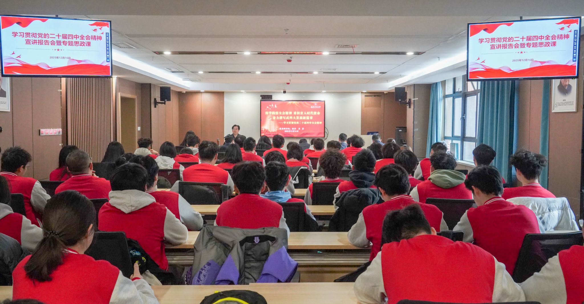 武科大网讯 12月16日上午,校党委副书记、校长吕勇到马德里康普顿斯学院,以“深学践悟全会精神 勇担育人时代使命 奋力谱写武科大发展新篇章”为题,为师生作党的二十届四中全会精神专题宣讲。