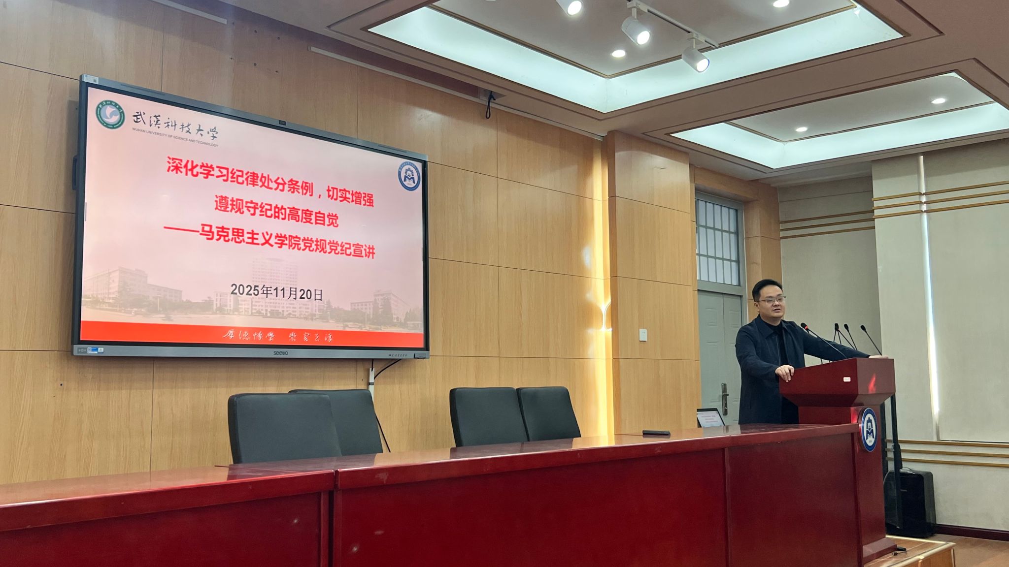 郭海沙结合近年来高校领域的实际案例,对《条例》进行了具体而深入的解读。他强调,《条例》是将党章要求具体化为纪律规定的实际行动,具有鲜明的政治性、突出的先进性、深刻的法治性,我们要坚持原原本本学、逐章逐条学、联系实际学,做到心存敬畏、手握戒尺,慎独慎微、勤于自省。
