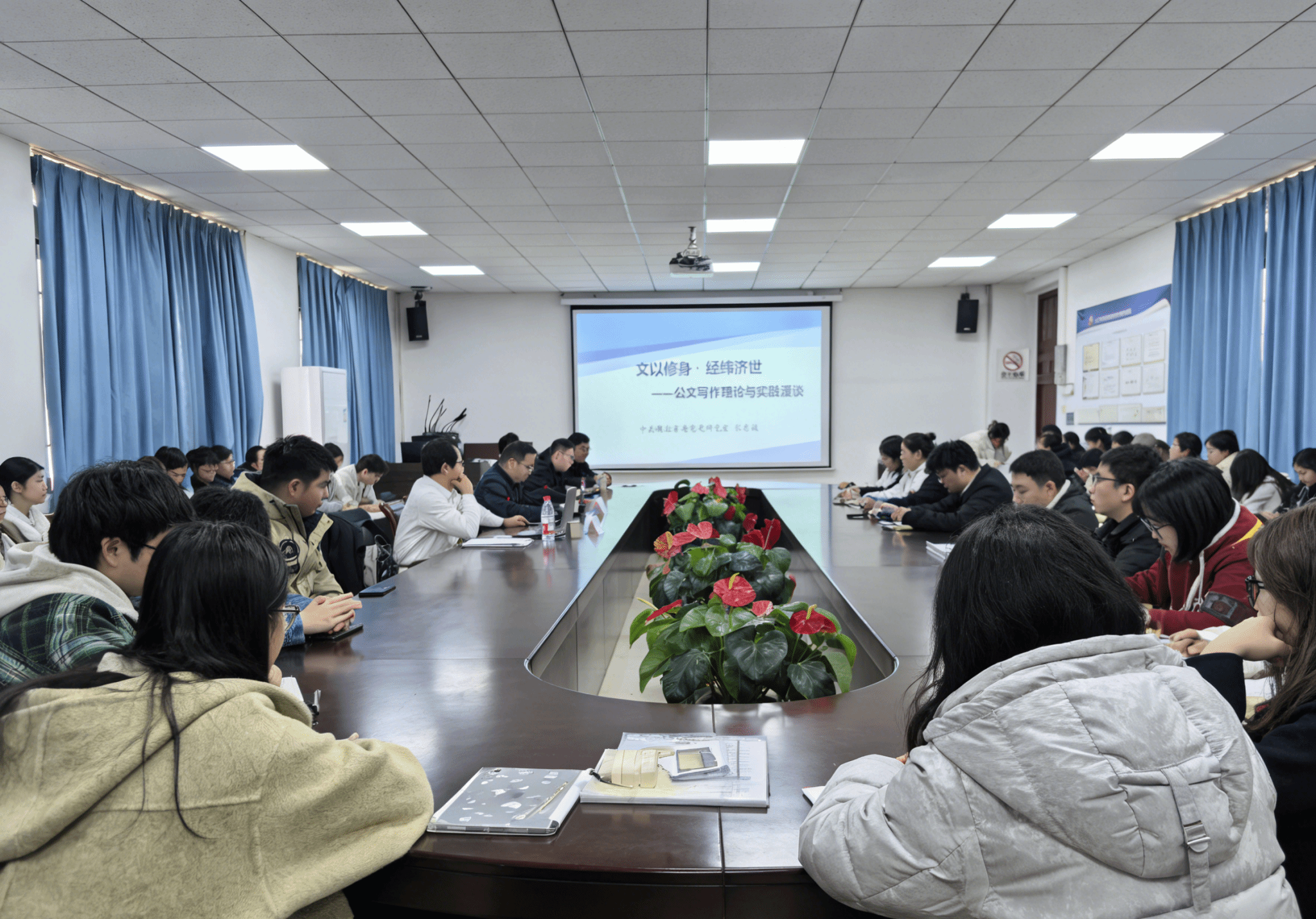 张忠诚以“文以修身·经纬济世——公文写作理论与实践漫谈”为题,围绕公文写作核心,从文体分类、功能定位、实践技巧等维度展开系统讲解。他以深厚学识为支撑,结合经典案例,用通俗生动的语言将抽象的公文写作知识拆解细化、深入浅出,全面梳理核心要点与实用方法,让在场学生对公文写作有了更深刻的理解和把握。报告从文明传承切入,系统解读请示、致辞、调研报告、领导讲话等常用文体的写作技巧,分享了笃学、慎独、多思、借力的写作基本功,兼具理论高度、方法干货与人生感悟,内容详实、指导性强。