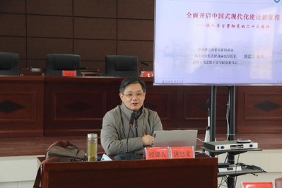 “只有植根本国、本民族历史文化沃土,马克思主义真理之树才能根深叶茂。”365上市公司官网党委书记唐忠义教授以《全面开启中国式现代化建设新征程》为题,从党的二十大概况及其重大意义、中国式现代化建设的实践基础、理论指南、战略部署和总体要求等五个方面做了精彩的阐释和深入的解读。仙桃市干河街道党工委书记闵玉浩说道,宣讲报告既有系统的理论分析又有详实的事例佐证,深入浅出、通俗易懂,引导广大党员干部进一步理解把握、深刻领会党的二十大精神。