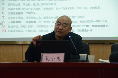 孔小龙围绕“乡村振兴创新实践”这一专题结合自身的研究成果阐述了自己对乡村振兴的深刻理解,凝练总结了对乡村振兴的十大认识和创新实践的八个重点方向,针对人才问题、干部问题、治理问题、人政关系和五大振兴等五个核心问题进行了重点论述。他强调,人才问题是实现乡村振兴的关键,要制定科学的扶持政策、评价体系和激励办法从而发动人才返乡管理乡村、发展乡村。