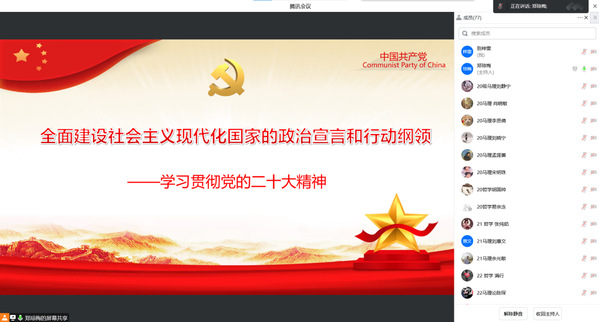 武科大网讯(通讯员焦元宁 别梓雯)为了更好地学习贯彻党的二十大精神,12月12日下午,马克思主义理论系教工党支部书记郑琼梅为学院全体研究生作了主题为《全面建设社会主义现代化国家的政治宣言和行动纲领》的宣讲报告。学院党委秘书郭海沙主持会议,学院全体研究生在腾讯会议线上聆听了宣讲。
