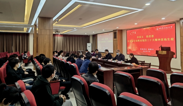 徐雁冰从深悟大会的主题、深悟过去五年的工作和新时代十年伟大变革、深悟开辟马克思主义中国话时代化的新境界、深悟新时代新征程中国共产党的使命任务、深悟教育科技人才重大支撑、深悟团结奋斗与青年强则国家强等六个方面,对党的二十大报告作了深入浅出的分析与解读,并结合学校、学院实际,就如何学习贯彻二十大报告精神提出了具体的要求,为在场师生上了一场精彩的思政课。