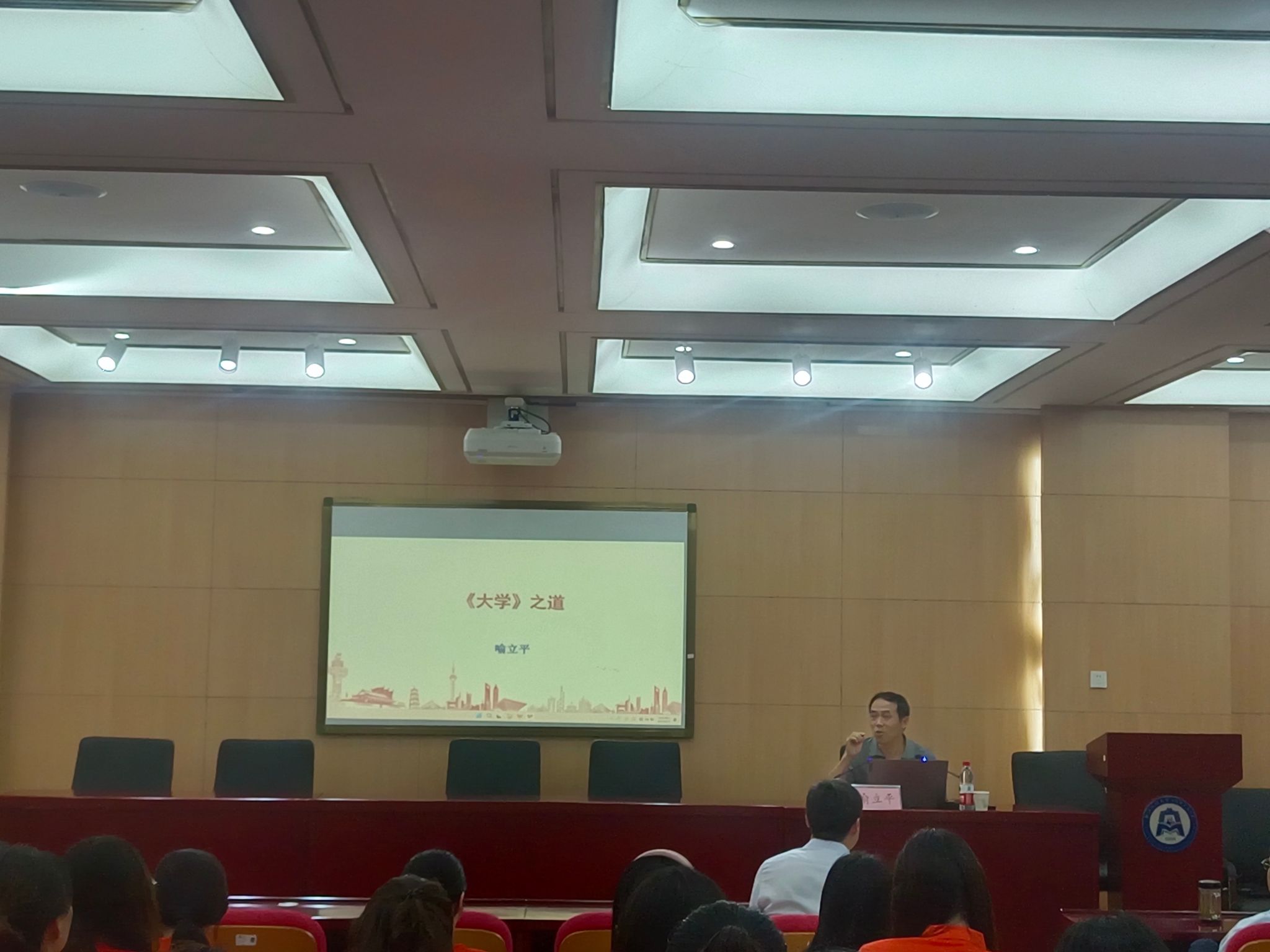 会上,喻立平以“为什么要读《大学》、读经典”这一问题开篇,介绍了《大学》的知识背景和六大哲学思想,紧密结合“必须要把马克思主义基本原理与中国具体实际相结合,与中华优秀传统文化相结合”这一必由之路,强调当代学生不仅应当传承生理基因,也应当坚定文化自信,传承文化基因;不仅应当读好马克思主义经典著作,也应当重视对中华优秀传统文化的学习。