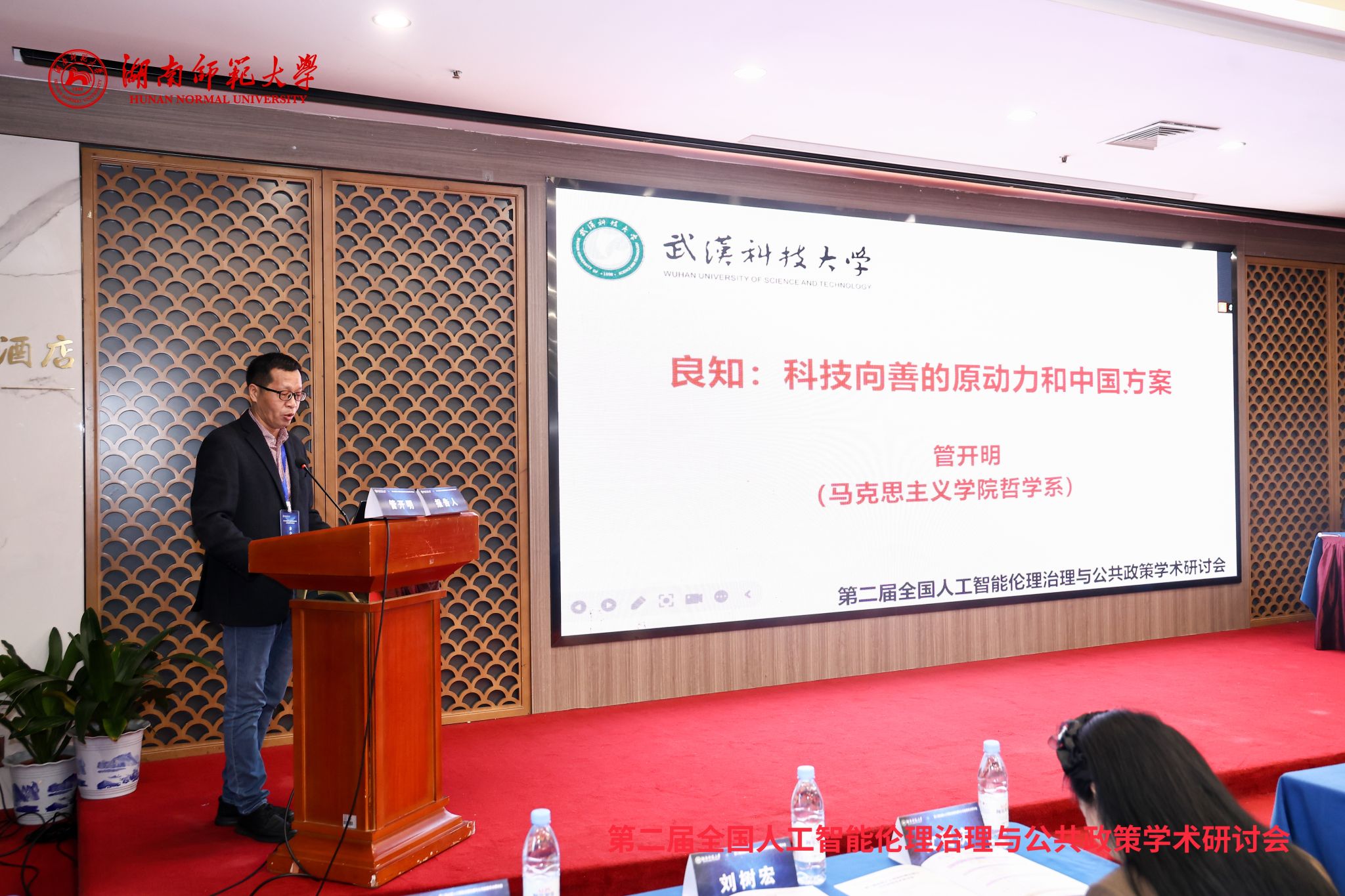 本网讯(通讯员邹煜)11月7日至9日,由中国自然辩证法研究会科技与工程伦理专业委员会、中国伦理学会科技伦理专业委员会、《自然辩证法通讯》杂志社等单位联合主办,长沙新一代人工智能伦理治理与公共政策实验室、湖南师范大学公共管理学院承办的“第二届全国人工智能伦理治理与公共政策学术研讨会”在长沙成功举办。本届研讨会汇聚了来自中山大学、华南师范大学、大连理工大学、电子科技大学等全国多所知名高校的著名学者、人工智能企业代表以及政府科技管理部门代表,围绕“智能向善”这一主题,就推进“智能向善”的理论体系建设和实践方案探索展开了深入研讨。我们哲学系主任管开明教授应邀参会并作大会报告。